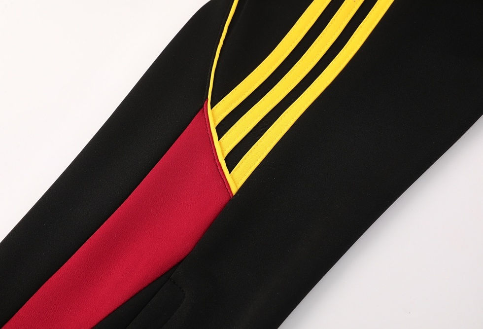 Striking Colorway: The jacket is a vibrant Red base accented with Yellow piping and details. The trousers are classic Black.