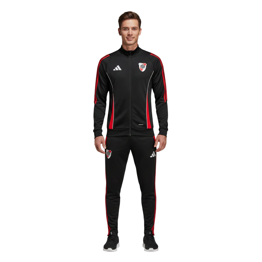 Authentic Club Pride: Features the official River Plate crest and the adidas Badge of Sport logo prominently on both the jacket and the pants.