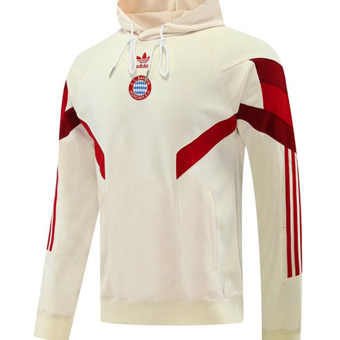 Club Allegiance: Features the official FC Bayern Munich crest and the classic Adidas Trefoil logo on both the hoodie and the joggers.