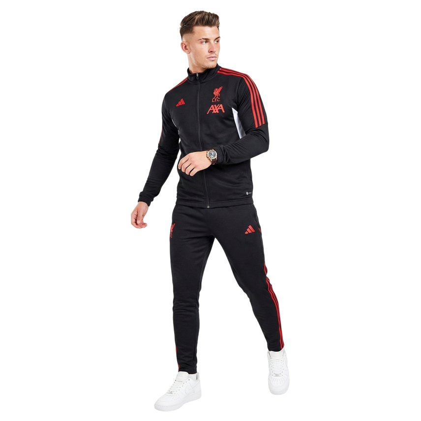 Authentic Club Pride: Features the iconic Liverpool FC Liverbird crest and the AXA sponsor logo (not explicitly shown on the jacket but implied by the set) alongside the adidas Badge of Sport logo. All branding is in Red.