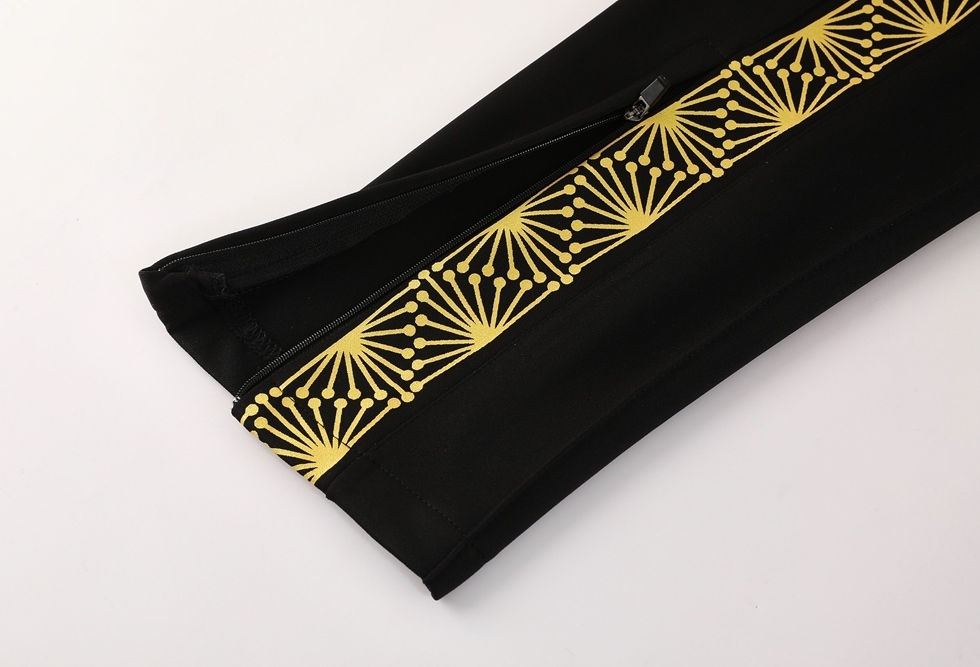 Striking Graphics: The standout feature is the Gold graphic side stripe running down the sleeves of the jacket and the legs of the pants, featuring a stylized sun ray or Aztec-inspired pattern.
