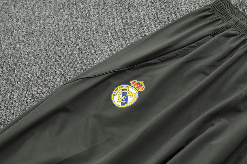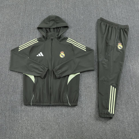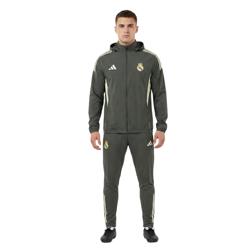 Official Club Crest: Features the authentic Real Madrid club crest prominently on the dark grey hooded jacket.
