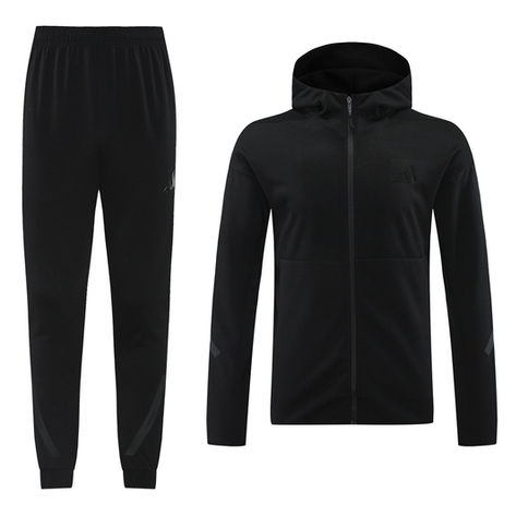Minimalist Design: The entire tracksuit maintains a sleek, monochrome all-black appearance, with subtle black-on-black branding (Badge of Sport/Three Stripes) for an understated, premium aesthetic.