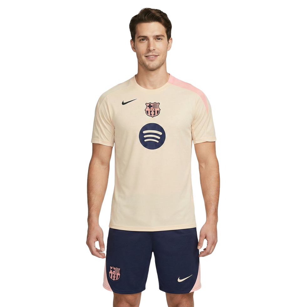 Beige tenue met minimalistische look. Een stijlvolle variant van Barça’s bekende klasse.