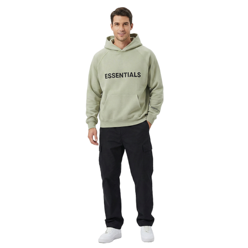Bold Branding: Features a prominent, large "ESSENTIALS" logo centered across the chest, typically in a contrasting black font.