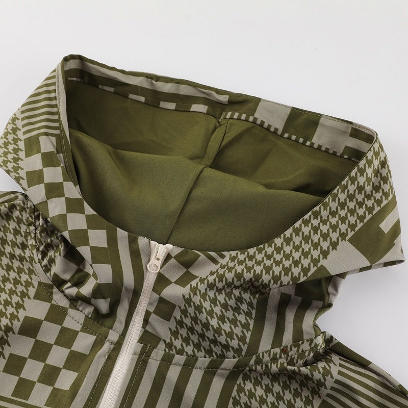 Distinctive Pattern: The hooded jacket boasts a bold, eye-catching olive green and white checkered/geometric pattern on the upper half and sleeves, making a strong fashion statement.