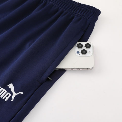 Train like the Cityzens with this official Puma Manchester City FC Full Zip Tracksuit Set. Designed for comfort and an athletic look, this set is perfect for training, travel, or proudly representing Man City with its classic navy and sky blue color combination.