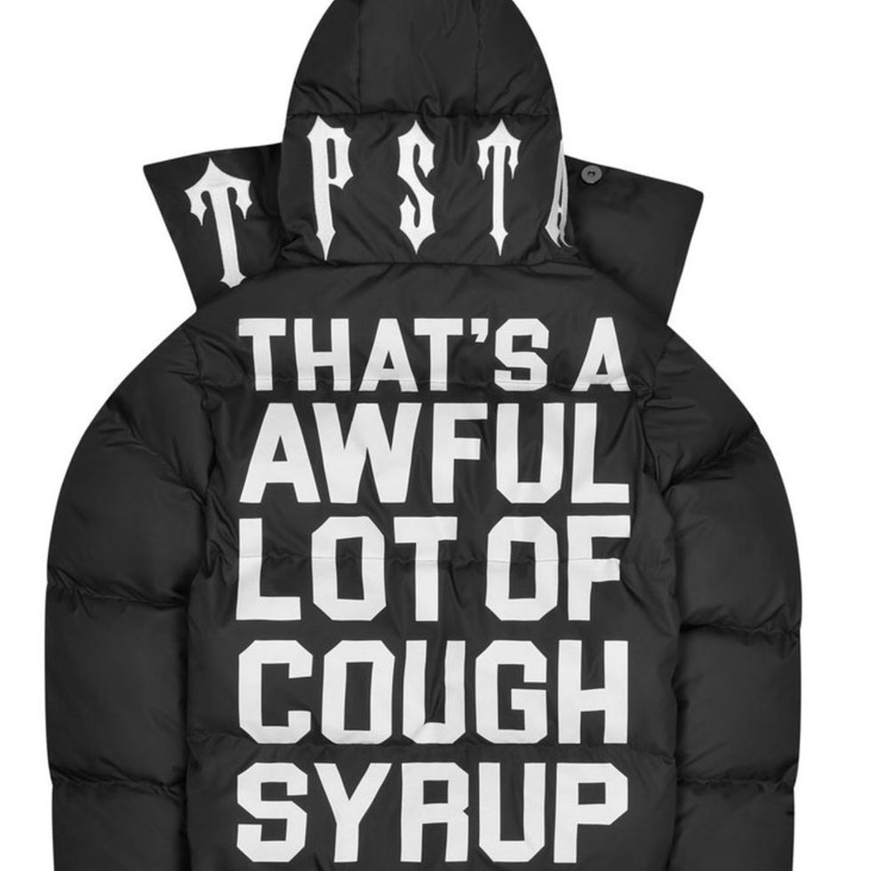Statement Back Graphic: The rear of the jacket is dominated by the oversized, bold text: "THAT'S A AWFUL LOT OF COUGH SYRUP", with the stylized TRAPSTAR logo visible on the hood.