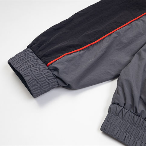 Color Block Design: Constructed from lightweight material with distinct panels, primarily in Grey and Black. The jacket features a grey body and black sleeves/collar, while the trousers have a grey front panel and black side/back panels.